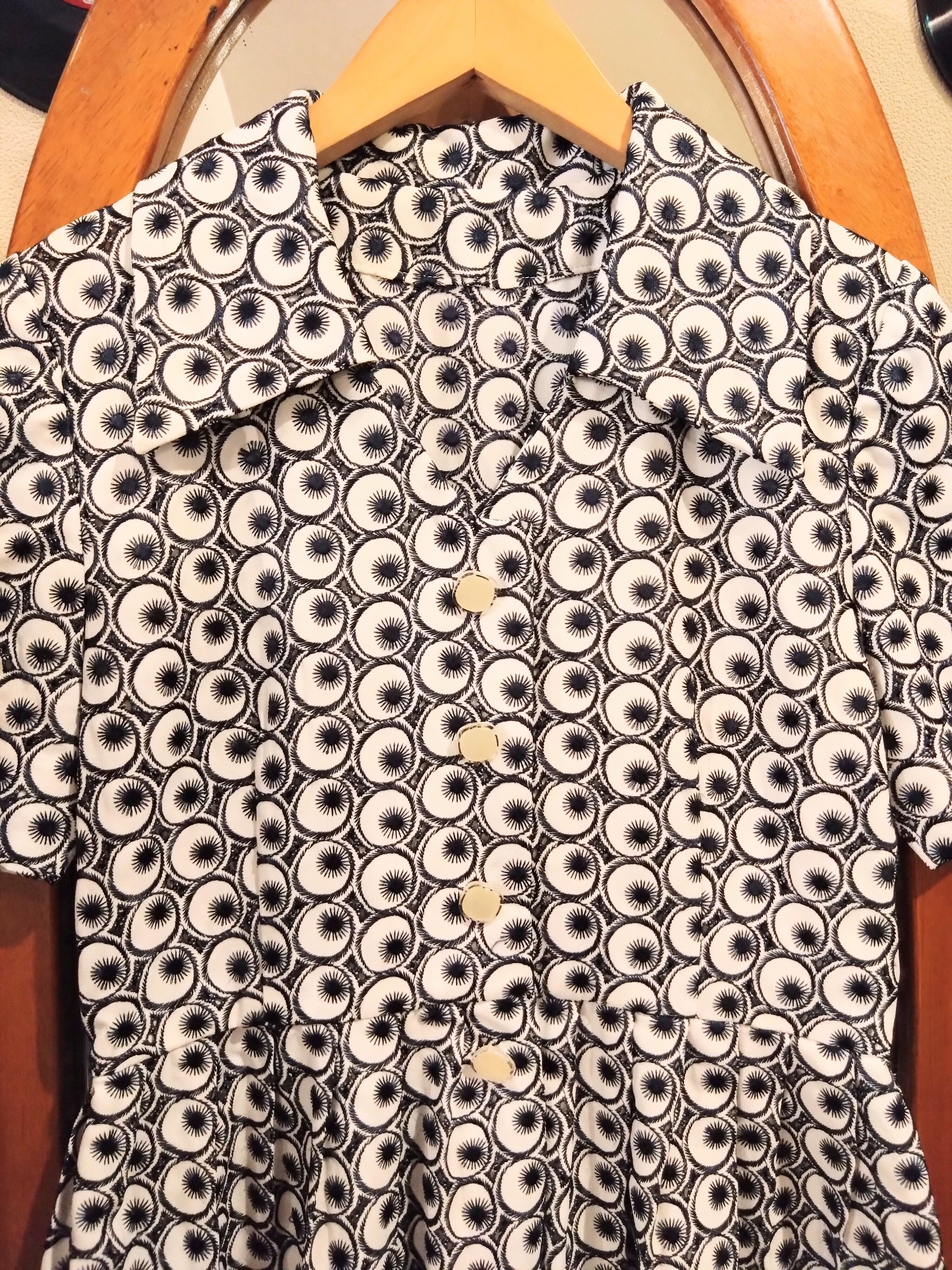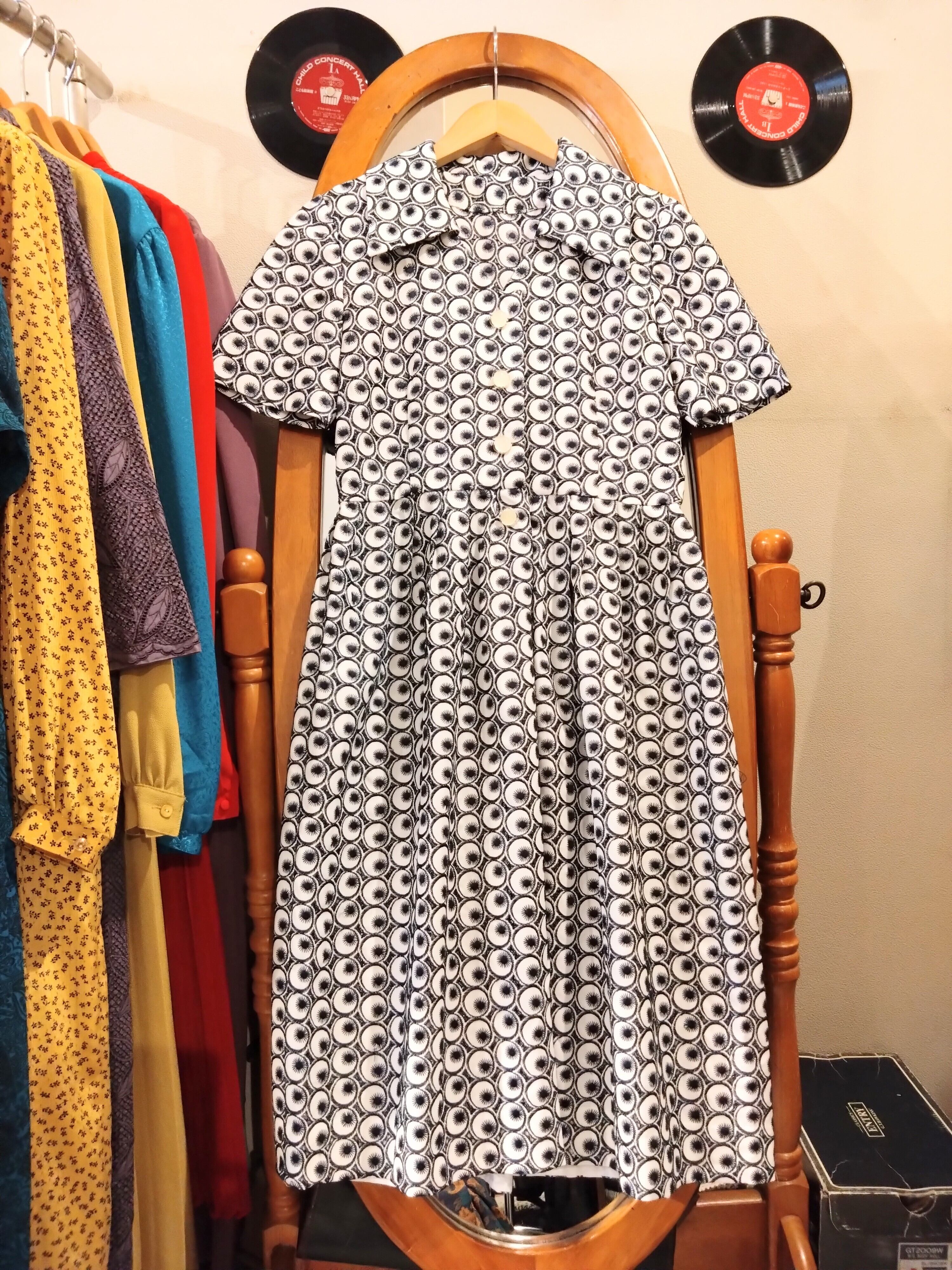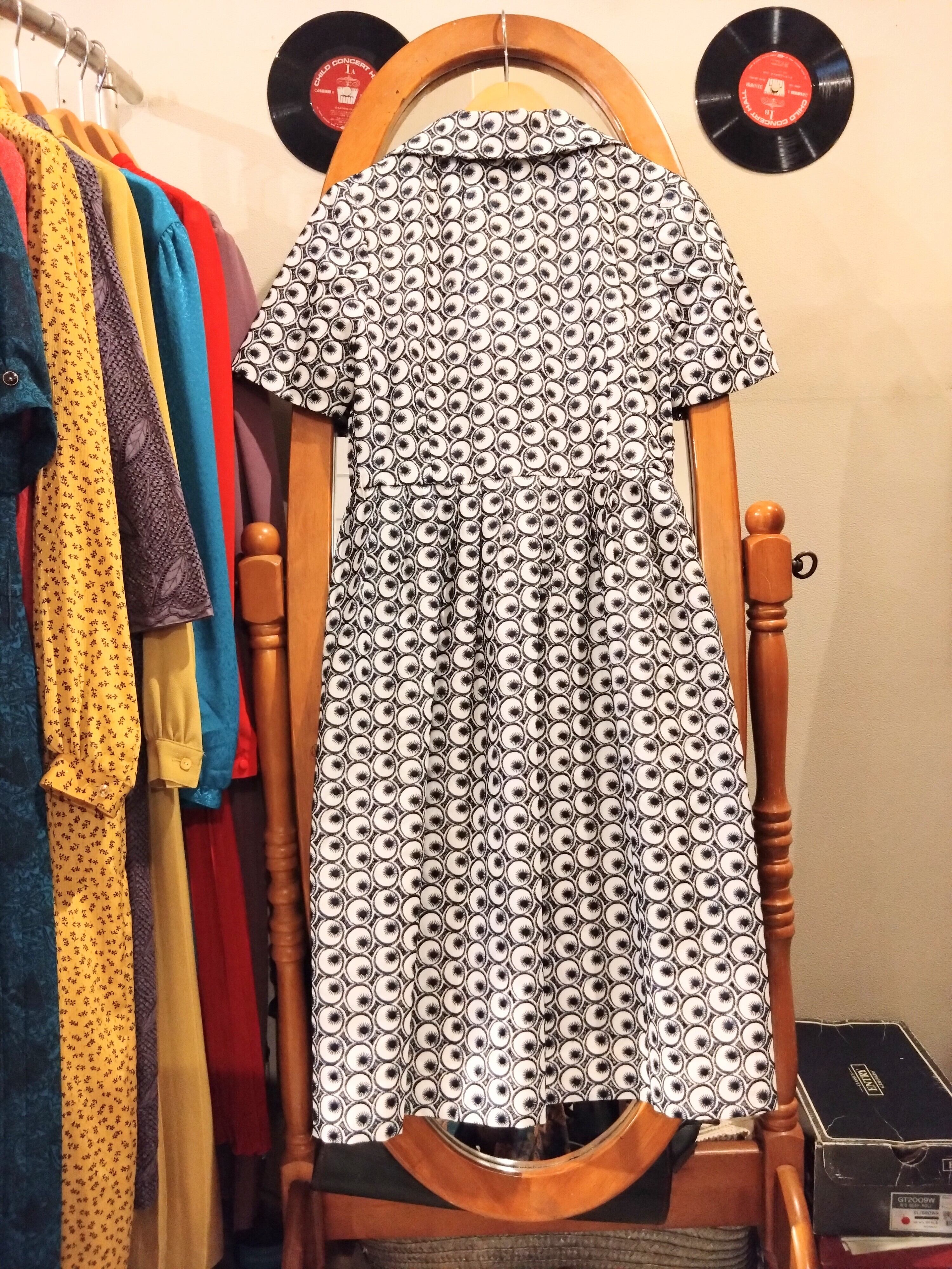 目玉みたいな卵みたいな謎の刺繍で埋め尽くされたちょっぴりホラーなレトロワンピースです。