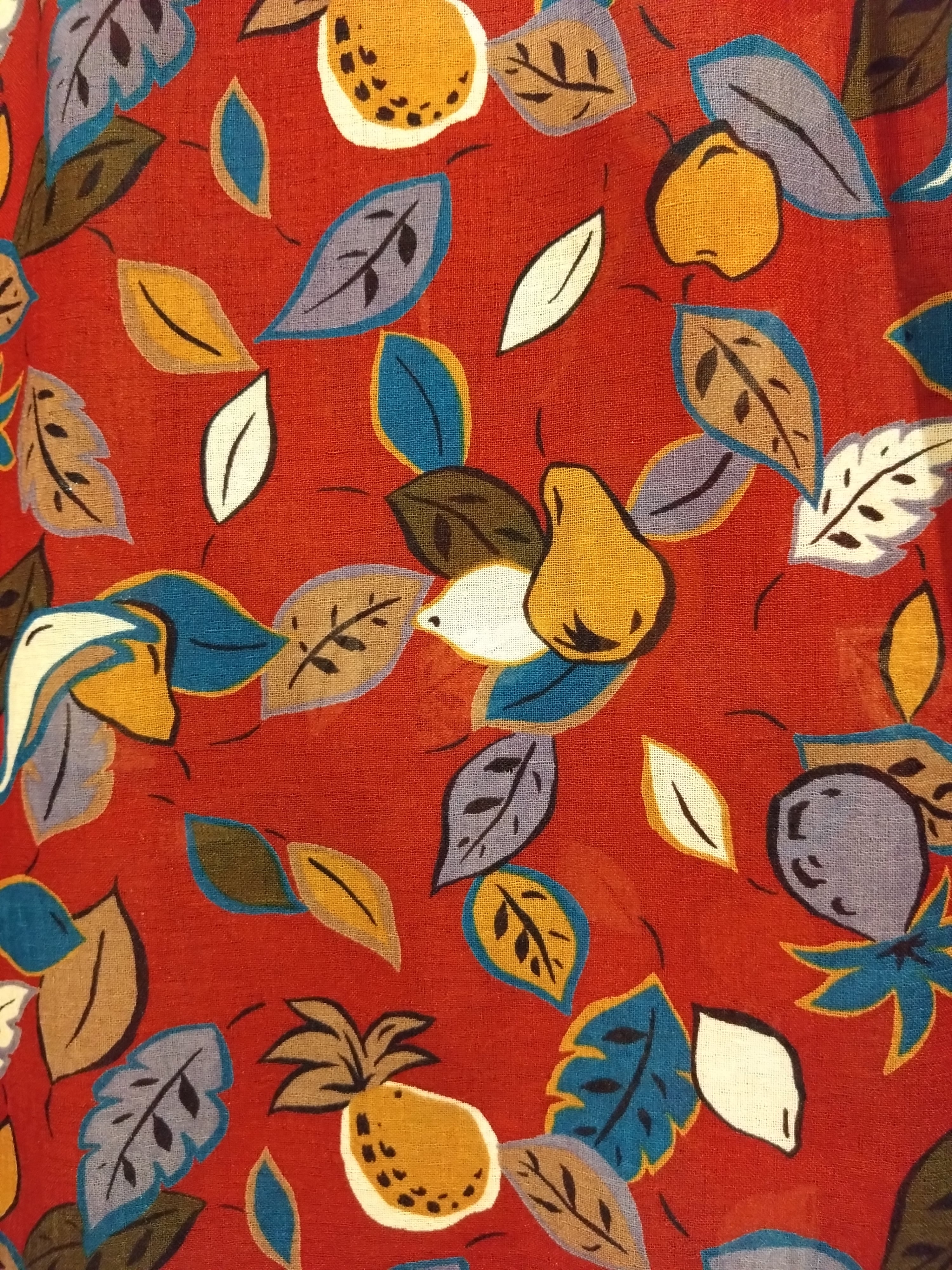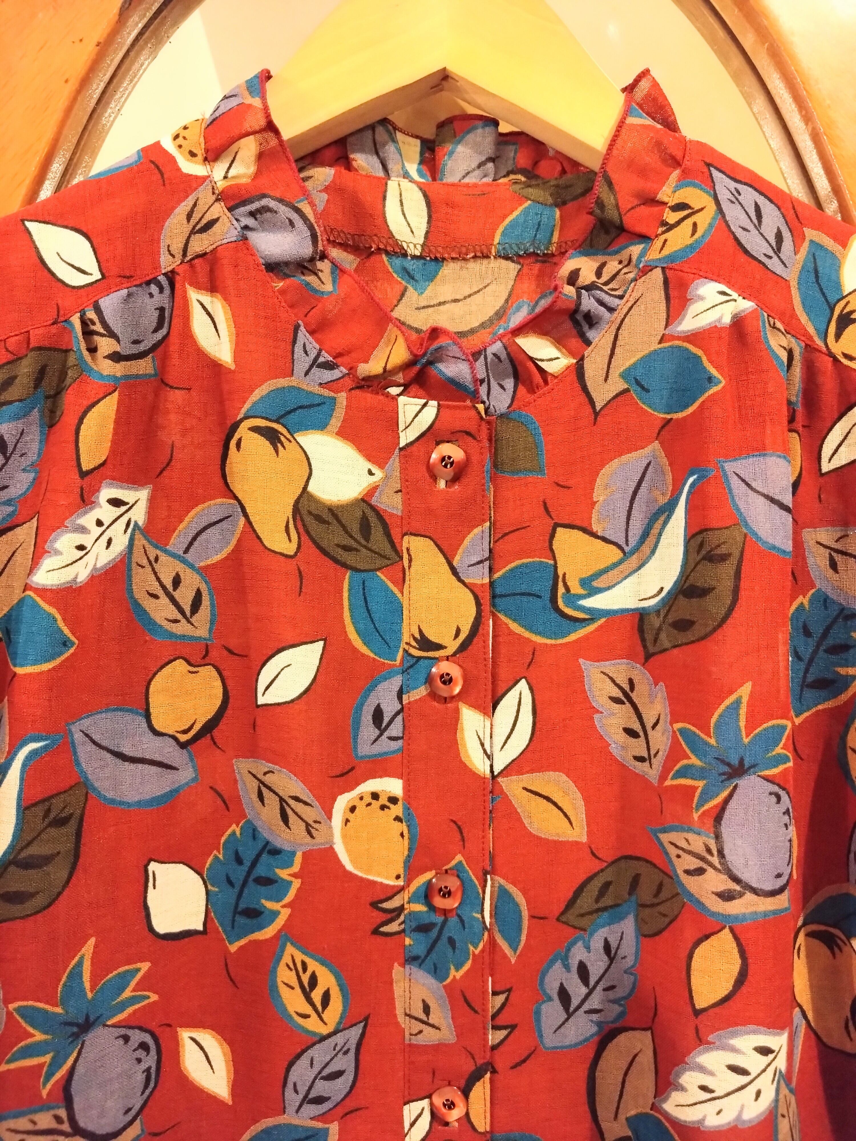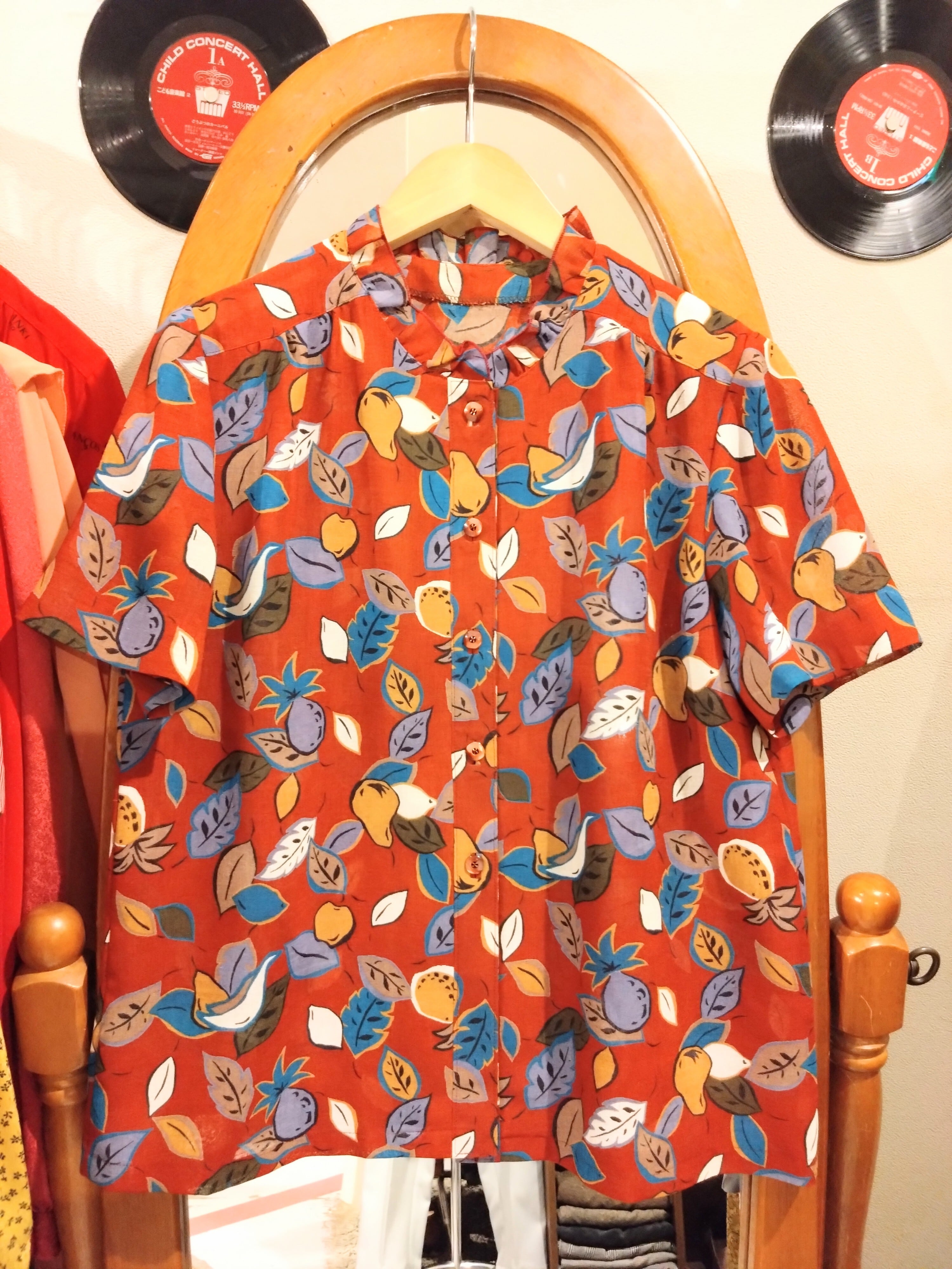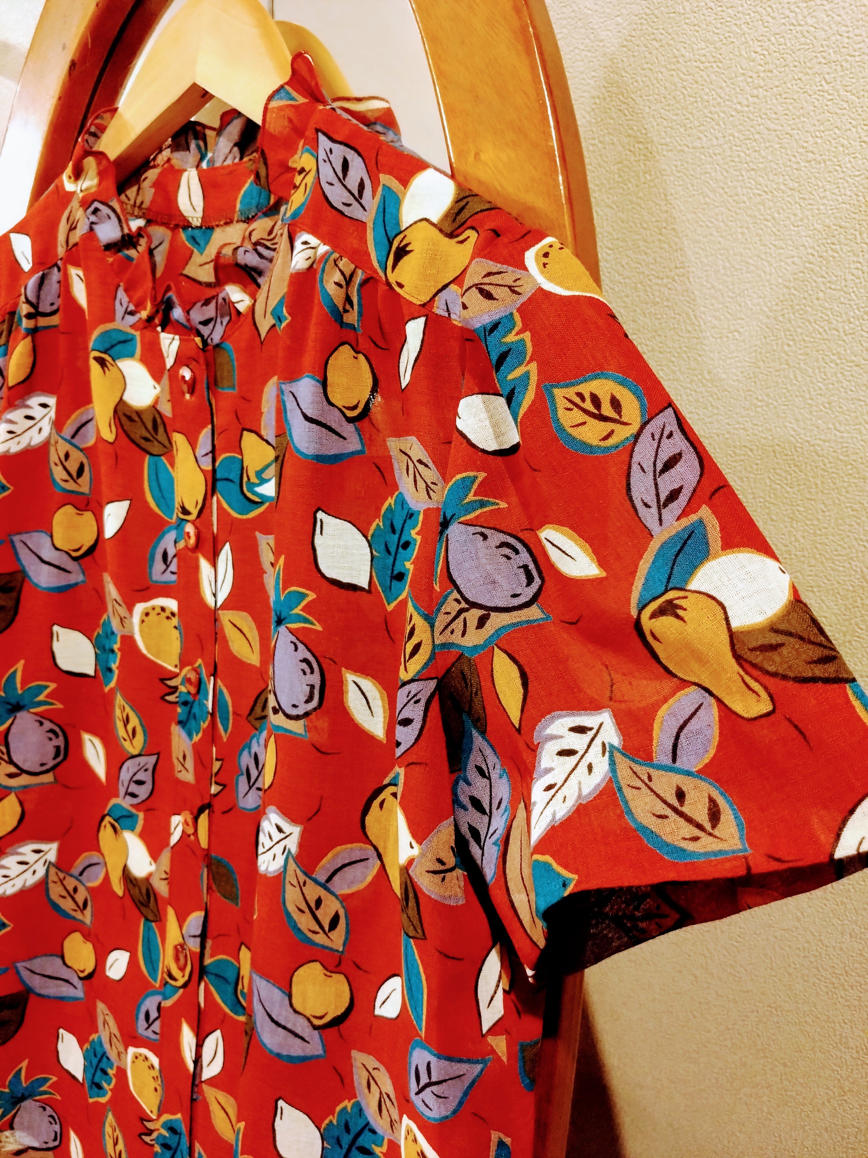洋梨やパイナップルなど果物をレトロな柄にしたフリル襟のブラウスです。